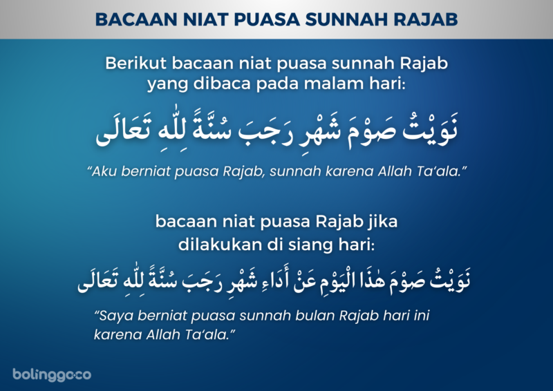 Latin: Allâhumma bârik lanâ fî rajabin wa sya’bâna wa ballighnâ syahra ramadhâna wa a’inna ‘alash-shiyâmi wal-qiyâmi wa hifzhil-lisâni wa ghadhdhil-bashari walâ taj’al hazhzhanâ minhul-jû’a wal-‘athasy.